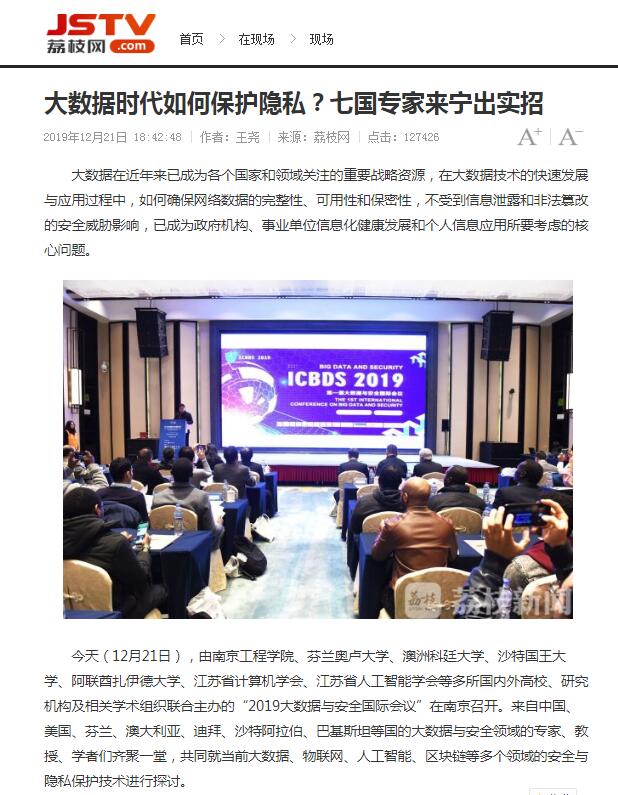 今天(12月21日),由15vip太阳集团官网、芬兰奥卢大学、澳洲科廷大学、沙特国王大学、阿联酋扎伊德大学、江苏省计算机学会、江苏省人工智能学会等多所国内外高校、研究机构及相关学术组织联合主办的“2019大数据与安全国际会议”在南京召开。来自中国、美国、芬兰、澳大利亚、迪拜、沙特阿拉伯、巴基斯坦等国的大数据与安全领域的专家、教授、学者们齐聚一堂,共同就当前大数据、物联网、人工智能、区块链等多个领域的安全与隐私保护技术进行探讨。