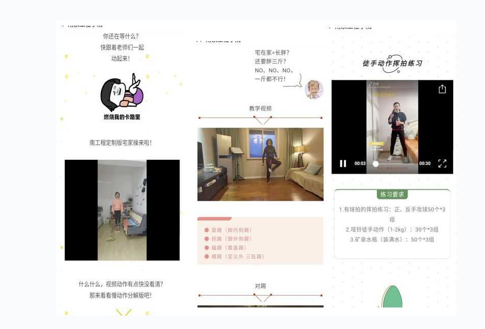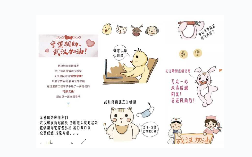 学校加强宣传引导,努力营造万众一心、众志成城的舆论氛围。统筹校内媒体,在微信公众号上开设“疫情防控”专栏,加大信息发布力度,深入宣传中央决策部署、疫情防控知识、学校防控安排,积极回应师生关切,增强战胜疫情的决心与信心。学校体育部为师生录制了居家运动指南(包括南工程定制版“宅家操”,足球、乒乓球、毽球),尽心设计张弛有度的动作,指导师生居家锻炼,提高免疫力;学生创作了手绘版漫画“宅家实录”,通过生动的表现形式引导师生“宅在家里”科学防疫。