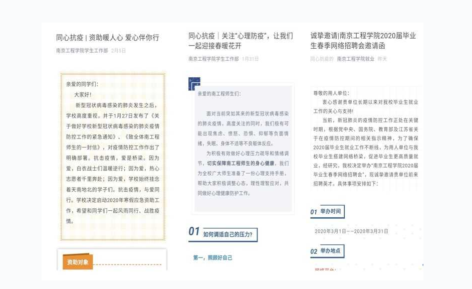 学校把解决学生的思想问题和实际问题相结合,全力进行思想引导、心理疏导、困难帮扶、就业指导等。对疫情严重地区的学生,辅导员倾注更多的关心,通过建微信群等方式与他们一直保持着一对一的联系,了解动态,表达慰问。为疏解学生们心理烦恼,学校及时开通了心理支持网络服务,准备了心理支持手册,老师们不厌其烦地为他们提供缓解焦虑的技巧,鼓励树立抗疫信心。为解决同学们在战“疫”期间的实际困难,学校启动2020年寒假应急资助工作,细致摸排需要受助学生情况,为他们及时送去温暖,风雨同行,共同战“疫”。学校启动了线上就业指导和招聘活动,筹备春季网络招聘会,积极为学生搭建桥梁。
