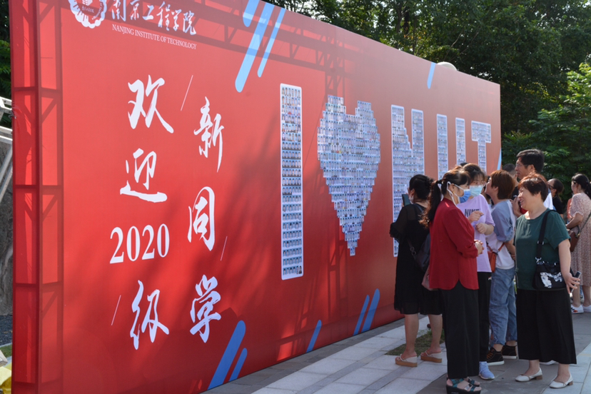 独立报到,是精彩大学生活的开场,校门口则成了新生与家长告别的地方。为了给新生和家长留下难忘的记忆,校门前,学校专门立起了大大的“笑脸墙”,“笑脸墙”是由2020级新生的照片组成“I❤NJIT”的字样。一早就有家长在这里找自己孩子的照片,与即将入校的孩子合影。墙上一张张笑脸,墙前一个个拥抱,绘成这个初秋最温暖、最动人的画面。