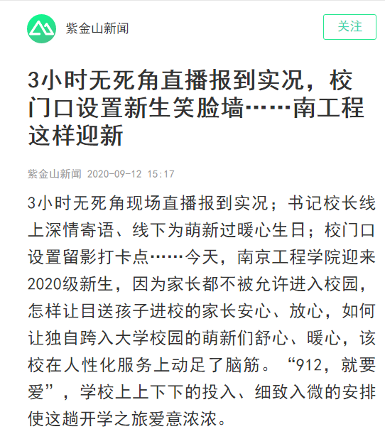 “不能将行李送至宿舍、不能为孩子整理床铺、甚至不能陪孩子进入校园……这是今年最让我们家长‘焦虑’的事情,前一天就收到了学校全程直播开学的通知,透过手机屏幕就能直击开学现场,多少让我们安心了许多。”一位来自连云港的家长说。
