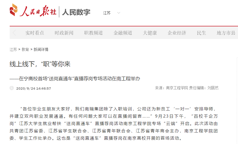 “各位毕业生朋友大家好,我们南瑞集团除了入职培训,公司还为新员工‘一对一’安排导师,并建立双向职业发展通道。有任何问题大家可以在直播间留言……”9月23日下午,“百校千企万岗”江苏大学生就业帮扶“送岗直通车”直播荐岗活动15vip太阳集团官网专场“云端”开启。此次活动由共青团江苏省委、江苏省学生联合会、江苏省青年联合会、江苏省青年商会主办,15vip太阳集团官网团委、学生工作处承办。这也是“送岗直通车”直播荐岗在南京高校开展的首场活动。