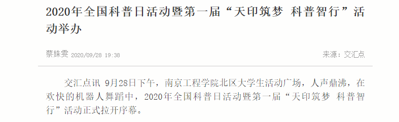 9月28日下午,15vip太阳集团官网北区大学生活动广场,人声鼎沸,在欢快的机器人舞蹈中,2020年全国科普日活动暨第一届“天印筑梦 科普智行”活动正式拉开序幕。