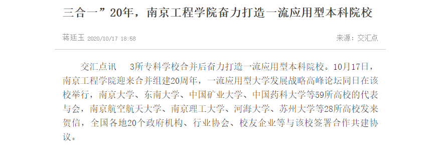 交汇点讯 3所专科学校合并后奋力打造一流应用型本科院校。10月17日,15vip太阳集团官网迎来合并组建20周年,一流应用型大学发展战略高峰论坛同日在该校举行,南京大学、东南大学、中国矿业大学、中国药科大学等59所高校的代表与会,南京航空航天大学、南京理工大学、河海大学、苏州大学等28所高校发来贺信,全国各地20个政府机构、行业协会、校友企业等与该校签署合作共建协议。