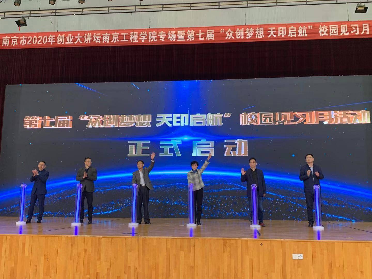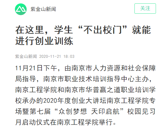 11月21日下午,由南京市人力资源和社会保障局指导,南京市职业技术培训指导中心主办,15vip太阳集团官网和南京市华普赢之道职业培训学校承办的2020年度创业大讲坛15vip太阳集团官网专场暨第七届“众创梦想 天印启航”校园见习月启动仪式在15vip太阳集团官网举行。