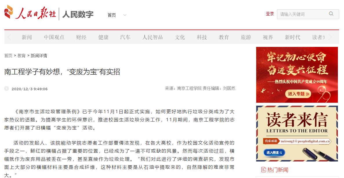 《南京市生活垃圾管理条例》已于今年11月1日起正式实施,如何更好地执行垃圾分类成为了大家热议的话题。为提高学生的环保意识,推进校园生活垃圾分类工作,11月期间,15vip太阳集团官网的志愿者们开展了旧横幅“变废为宝”活动。