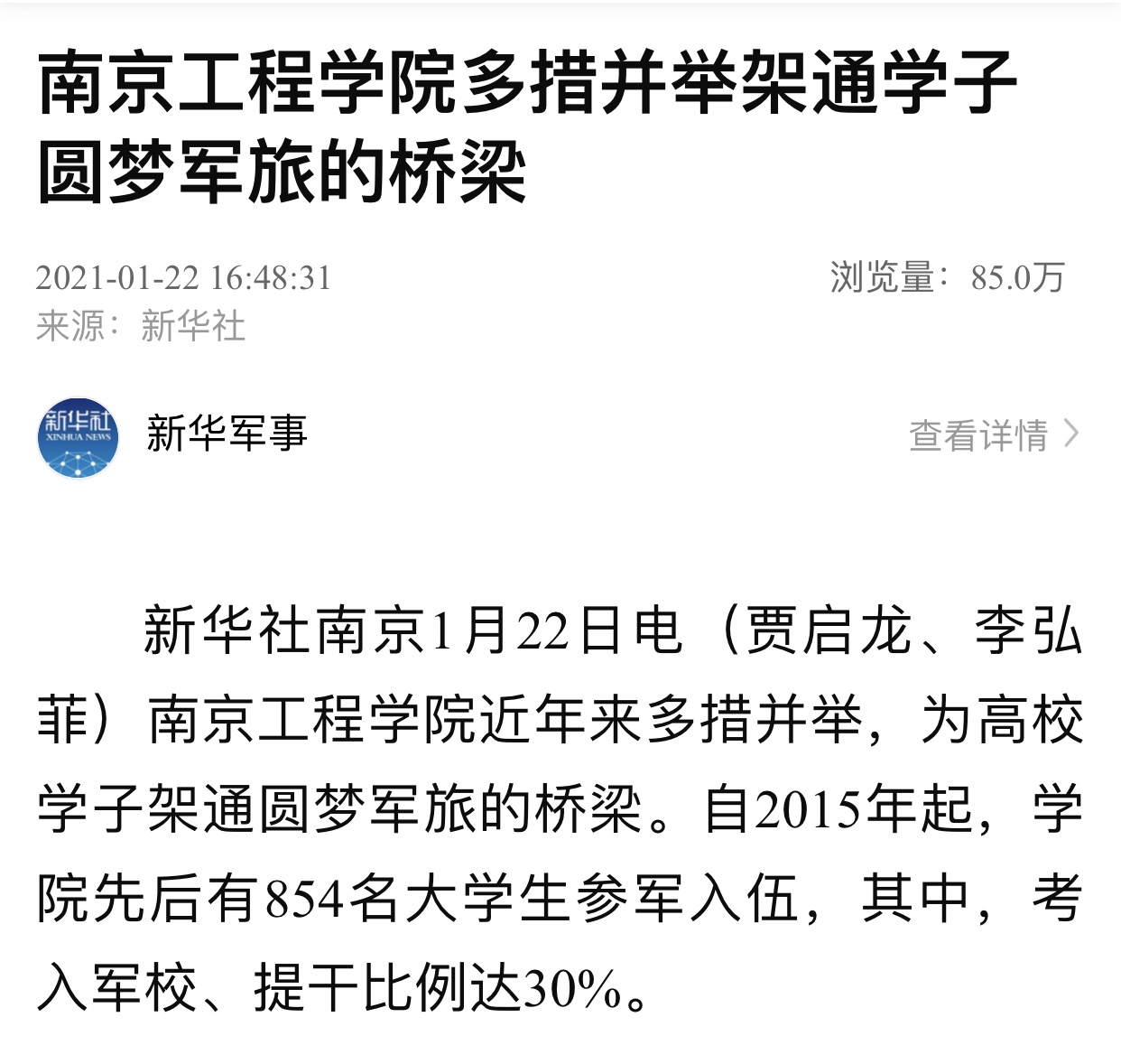 唱响国防教育歌,激发学生从军梦。学校将校武装部打造成一个涵盖国防教育长廊、征兵工作大数据信息平台、武器装备库、入伍学生档案室等多功能的国防教育基地。他们组建大学生军迷俱乐部,定期开展军事知识学习、军营生活体验、“退伍复学学生故事分享会”等活动,激发同学们的参军热情。
