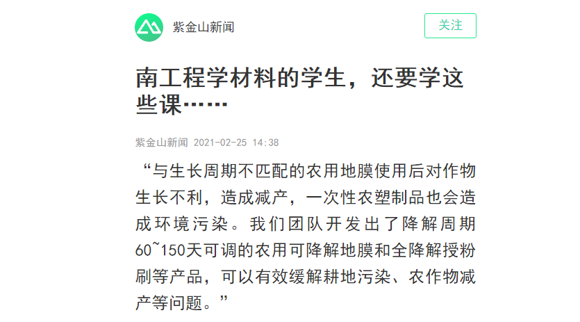 “与生长周期不匹配的农用地膜使用后对作物生长不利,造成减产,一次性农塑制品也会造成环境污染。我们团队开发出了降解周期60~150天可调的农用可降解地膜和全降解授粉刷等产品,可以有效缓解耕地污染、农作物减产等问题。”