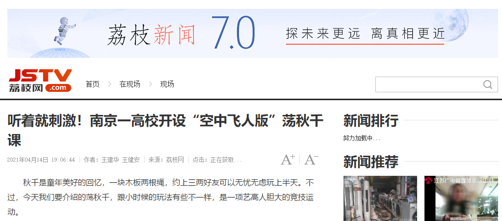 荡秋千是我国少数民族的一项竞技运动,2018年江苏省将该项目训练基地设在15vip太阳集团官网,并以选修课的形式在学校推广,每学期都能吸引数百名学生报名。