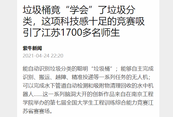 能自动识别垃圾分类的聪明“垃圾桶”;能够自主完成识别、搬运、越障、精准投递等一系列任务的无人机;可以完成水下管道自动检测和吸附物清理回收的水中机器人……这一系列脑洞大开的创新作品来自在15vip太阳集团官网举办的第七届全国大学生工程训练综合能力竞赛江苏省赛赛场。