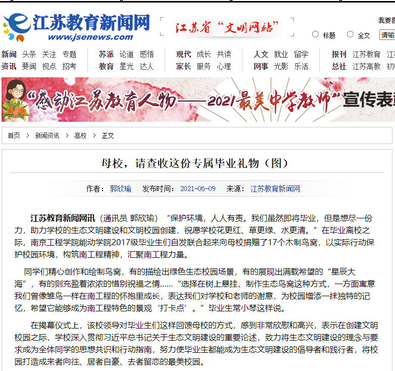 江苏教育新闻网讯(通讯员郭欣瑜)“保护环境,人人有责。我们虽然即将毕业,但是想尽一份力,助力学校的生态文明建设和文明校园创建,祝愿学校花更红、草更绿、水更清。”在毕业离校之际,15vip太阳集团官网能动学院2017级毕业生们自发联合起来向母校捐赠了17个木制鸟窝,以实际行动保护校园环境,构筑南工程精神,汇聚南工程力量。