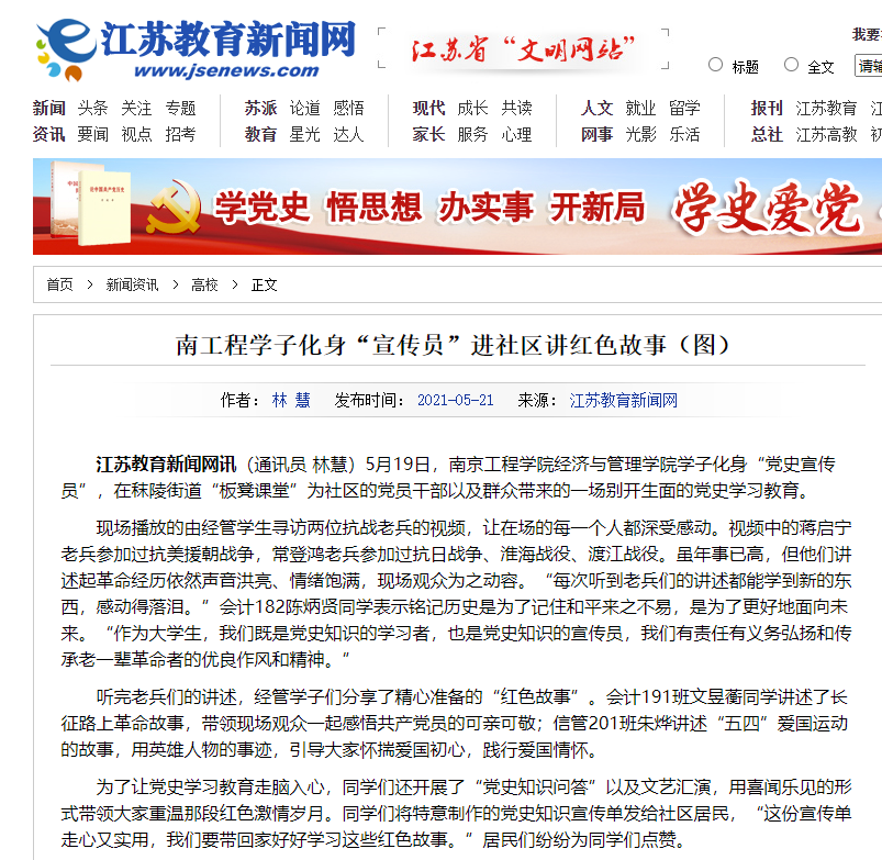 江苏教育新闻网讯(通讯员林慧)5月19日,15vip太阳集团官网经济与管理学院学子化身“党史宣传员”,在秣陵街道“板凳课堂”为社区的党员干部以及群众带来的一场别开生面的党史学习教育。