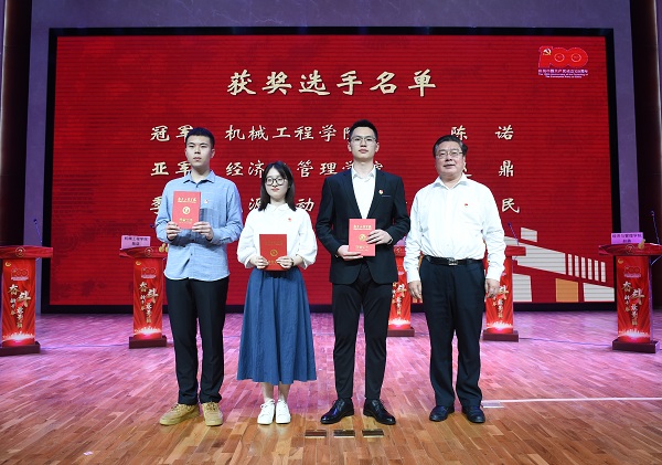 近三个小时的比赛,500多名师生观众时而凝视细听,时而鼓掌喝彩,在政治性与知识性,生动性与互动性相得益彰的活动中感悟革命精神、汲取前行力量。“通过这次知识竞赛,对百年党史有了更深入的了解,也深刻认识到学习党史的重大意义。在接下来的学习生活中,我将不断深化党史学习,不忘初心使命,学思践悟,以更加优异的成绩向建党百年献礼!”比赛冠军陈诺表示。