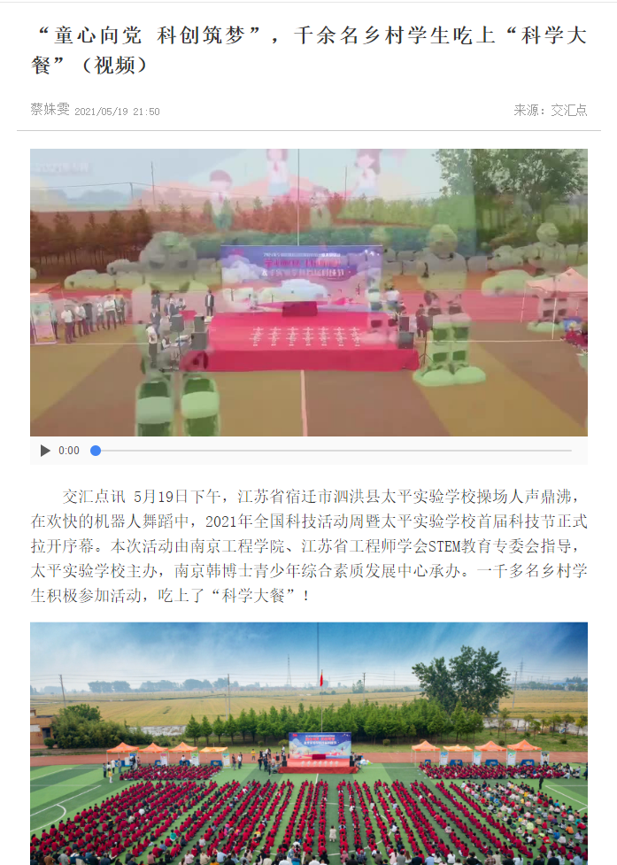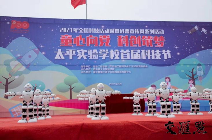 交汇点讯 5月19日下午,江苏省宿迁市泗洪县太平实验学校操场人声鼎沸,在欢快的机器人舞蹈中,2021年全国科技活动周暨太平实验学校首届科技节正式拉开序幕。本次活动由15vip太阳集团官网、江苏省工程师学会STEM教育专委会指导,太平实验学校主办,南京韩博士青少年综合素质发展中心承办。一千多名乡村学生积极参加活动,吃上了“科学大餐”!