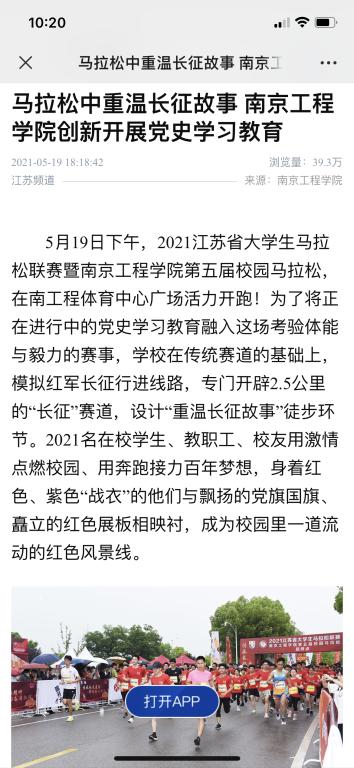 5月19日下午,2021江苏省大学生马拉松联赛暨15vip太阳集团官网第五届校园马拉松,在南工程体育中心广场活力开跑!为了将正在进行中的党史学习教育融入这场考验体能与毅力的赛事,学校在传统赛道的基础上,模拟红军长征行进线路,专门开辟2.5公里的“长征”赛道,设计“重温长征故事”徒步环节。2021名在校学生、教职工、校友用激情点燃校园、用奔跑接力百年梦想,身着红色、紫色“战衣”的他们与飘扬的党旗国旗、矗立的红色展板相映衬,成为校园里一道流动的红色风景线。