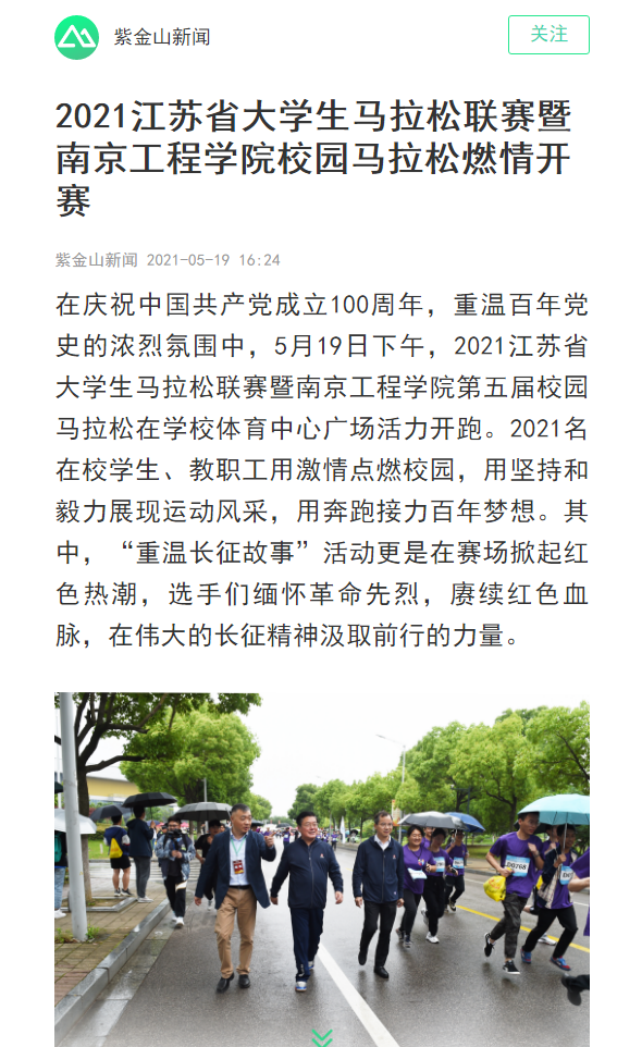 在庆祝中国共产党成立100周年,重温百年党史的浓烈氛围中,5月19日下午,2021江苏省大学生马拉松联赛暨15vip太阳集团官网第五届校园马拉松在学校体育中心广场活力开跑。2021名在校学生、教职工用激情点燃校园,用坚持和毅力展现运动风采,用奔跑接力百年梦想。其中,“重温长征故事”活动更是在赛场掀起红色热潮,选手们缅怀革命先烈,赓续红色血脉,在伟大的长征精神汲取前行的力量。