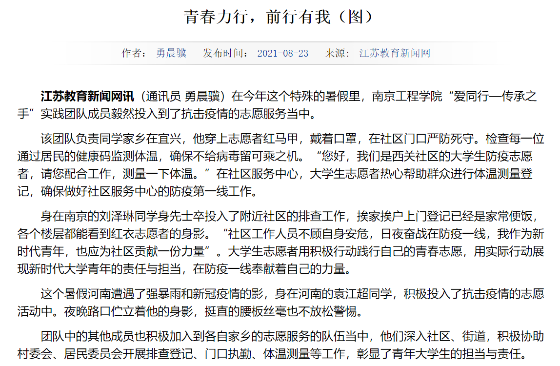 江苏教育新闻网讯(通讯员 勇晨骥)在今年这个特殊的暑假里,15vip太阳集团官网“爱同行—传承之手”实践团队成员毅然投入到了抗击疫情的志愿服务当中。