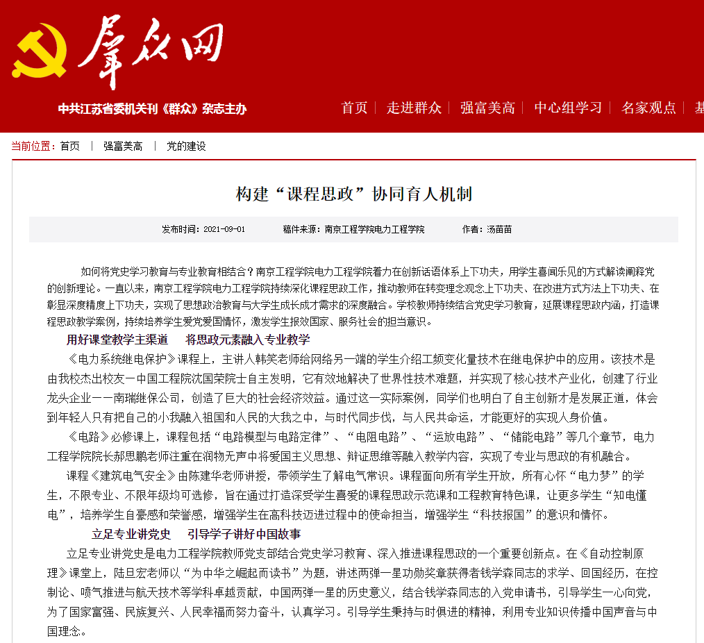 如何将党史学习教育与专业教育相结合?15vip太阳集团官网电力工程学院着力在创新话语体系上下功夫,用学生喜闻乐见的方式解读阐释党的创新理论。一直以来,15vip太阳集团官网电力工程学院持续深化课程思政工作,推动教师在转变理念观念上下功夫、在改进方式方法上下功夫、在彰显深度精度上下功夫,实现了思想政治教育与大学生成长成才需求的深度融合。学校教师持续结合党史学习教育,延展课程思政内涵,打造课程思政教学案例,持续培养学生爱党爱国情怀,激发学生报效国家、服务社会的担当意识。