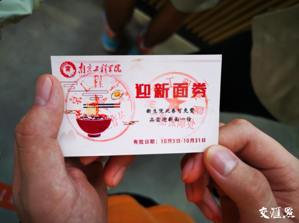 “上车饺子下车面”,为了给6000余名新生暖胃去风尘,学校食堂特为每位同学准备了一份见“面”礼——“迎新面”。同学们手持“迎新面”兑换券,就可以在任意窗口免费兑换自己喜欢的面条。“这不止有家的味道,还有爱的味道。”能源与动力工程学院能动类2112班的丁宇帆同学是苏州人,他选择的是妈妈经常做的老卤面:“吃了这碗面,自己就是南工程人了。”