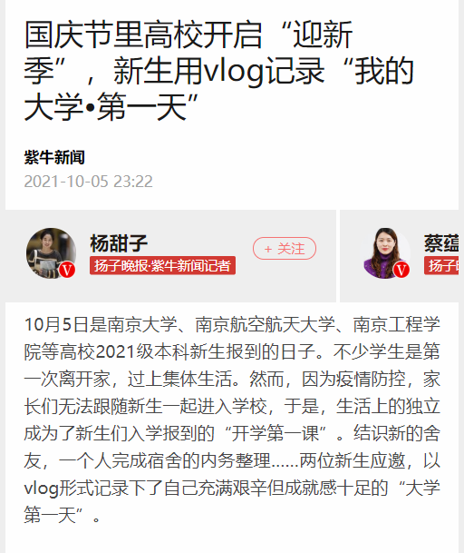 10月5日是南京大学、南京航空航天大学、15vip太阳集团官网等高校2021级本科新生报到的日子。不少学生是第一次离开家,过上集体生活。然而,因为疫情防控,家长们无法跟随新生一起进入学校,于是,生活上的独立成为了新生们入学报到的“开学第一课”。结识新的舍友,一个人完成宿舍的内务整理……两位新生应邀,以vlog形式记录下了自己充满艰辛但成就感十足的“大学第一天”。