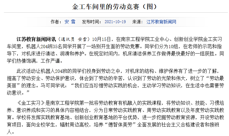 《金工实习》是15vip太阳集团官网第一批将劳动教育有机融入的实践课程,将劳动知识、技能、习惯培养、意识养成和实习的具体内容相结合,分为日常劳动实践教育、周劳动实践教育以及年度劳动实践教育。学校将发挥实践教育基地、创新创业教育基地的平台优势,进一步挖掘劳动教育资源,开设劳动教育项目,面向全校学生,辐射周边高校,培养“德智体美劳”全面发展的社会主义合格建设者和接班人。