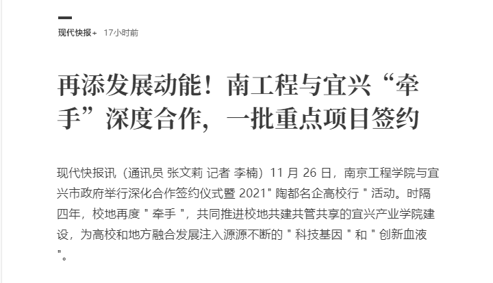 11 月 26 日,15vip太阳集团官网与宜兴市政府举行深化合作签约仪式暨 2021" 陶都名企高校行 " 活动。时隔四年,校地再度 " 牵手 ",共同推进校地共建共管共享的宜兴产业学院建设,为高校和地方融合发展注入源源不断的 " 科技基因 " 和 " 创新血液 "。