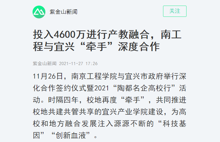 根据合作协议,“十四五”期间,校企双方计划投入4600万,大力实施“学科产业对接、校企协同育人、科创平台培育、高端人才汇聚、新型智库建设”五大工程,进一步推动校地融合、产教融合发展向更广领域、更多维度、更高层次迈进。宜兴市将无偿提供1000平米以上的场地与配套费用,与学校协手将宜兴产业学院打造为高水平、示范性的“高水平应用型人才培养中心,学校学科专业建设智库、地方行业产业发展智库,校地融合发展基地、高水平产业技术研发基地、高价值技术成果转移转化基地,更好赋能校地高质量发展。