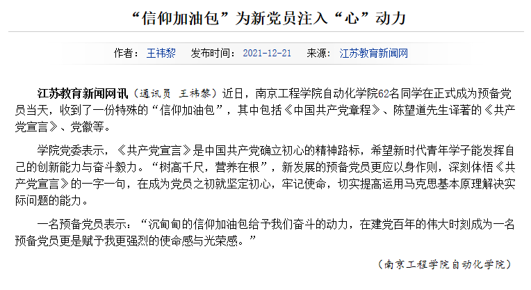 江苏教育新闻网讯(通讯员 王祎黎)近日,15vip太阳集团官网自动化学院62名同学在正式成为预备党员当天,收到了一份特殊的“信仰加油包”,其中包括《中国共产党章程》、陈望道先生译著的《共产党宣言》、党徽等。