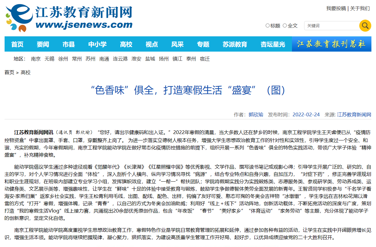 江苏教育新闻网讯(通讯员 郭欣瑜)“您好,请出示健康码和出入证。”2022年寒假的清晨,当大多数人还在梦乡的时候,15vip太阳集团官网学生王天睿便已从“疫情防控物资盒”中拿出面罩、手套、口罩,穿戴整齐上岗了。 为进一步落实立德树人根本任务,增强大学生思想政治教育工作的针对性和实效性,引导学生度过一个安全、和谐、充实的假期,今年寒假期间,15vip太阳集团官网能动学院在做好常态化疫情防控措施的前提下,组织开展一系列“色香味”俱全的特色实践活动,带领广大学子体验“精神盛宴”,补充精神食粮。