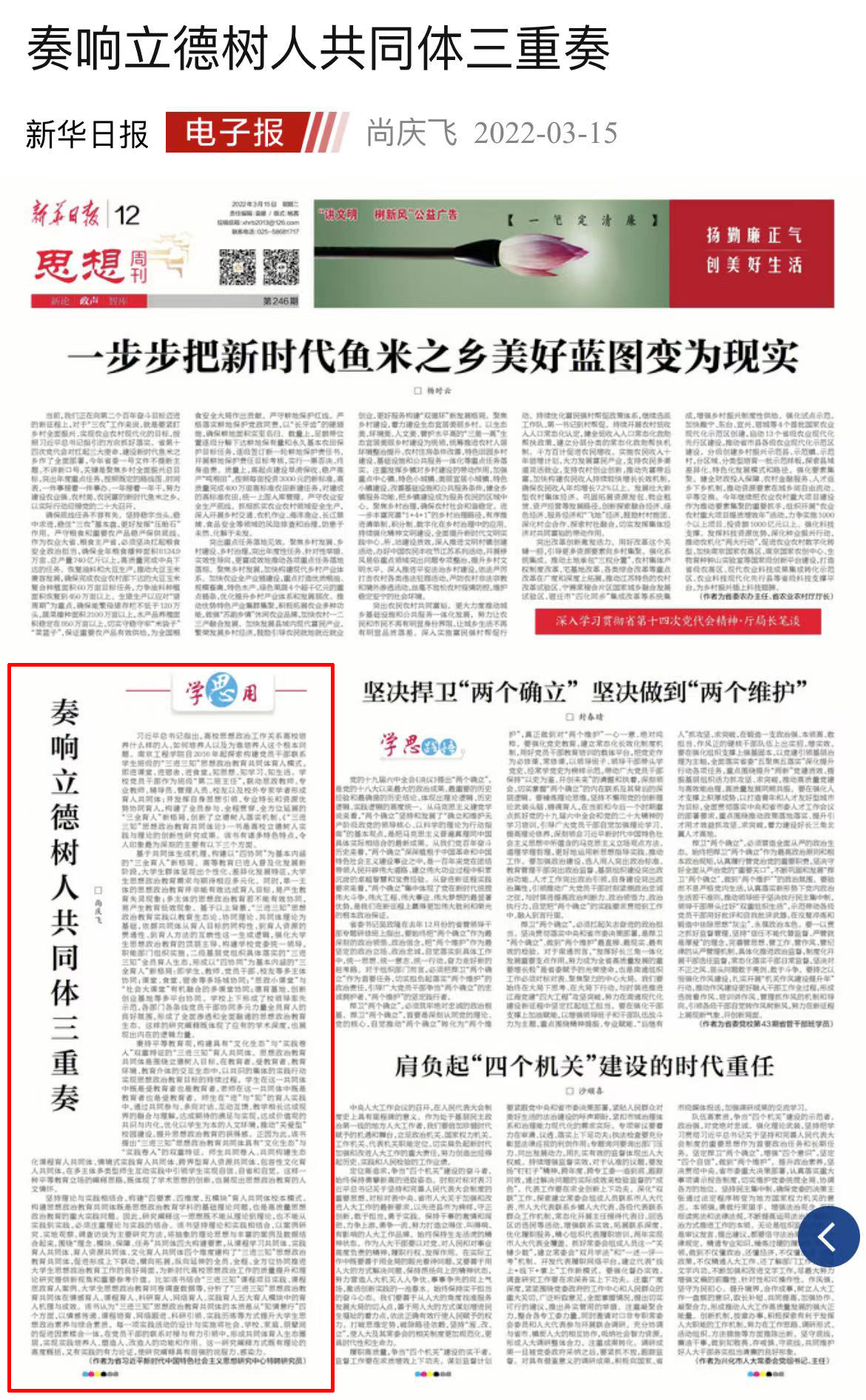 新闻链接:http://newspaper.xhby.net/?act=article&aid=1041603&layountIndex=11&date=20220315&siteID=2&id=1
