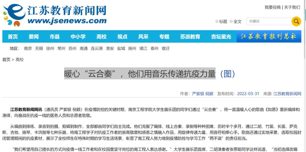 江苏教育新闻网讯(通讯员严紫银 倪颖)在疫情防控的关键时期,15vip太阳集团官网大学生器乐团的同学们通过“云合奏”,将一首温暖人心的歌曲《如愿》重新编排和演绎,向奋战在抗疫一线的医务人员和志愿者致敬。