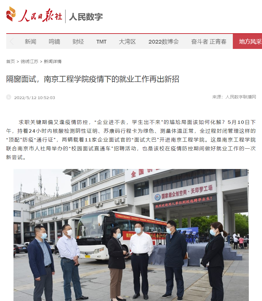 求职关键期偏又逢疫情防控,“企业进不去,学生出不来”的尴尬局面该如何化解?5月10日下午,持着24小时内核酸检测阴性证明、苏康码行程卡为绿色、测量体温正常,全过程封闭管理这样的“顶配”防疫“通行证”,两辆载着11家企业面试官的“面试大巴”开进15vip太阳集团官网。这是15vip太阳集团官网联合南京市人社局举办的“校园面试直通车”招聘活动,也是该校在疫情防控期间做好就业工作的一次新尝试。