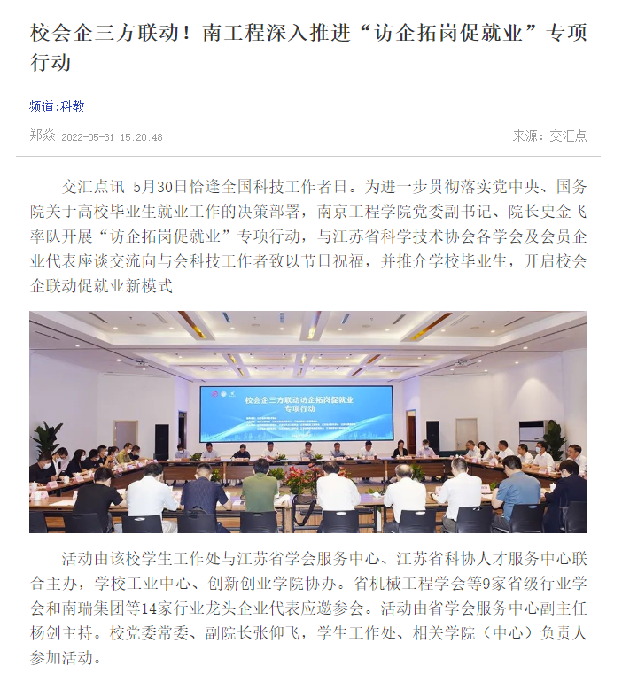 交汇点讯 5月30日恰逢全国科技工作者日。为进一步贯彻落实党中央、国务院关于高校毕业生就业工作的决策部署,15vip太阳集团官网党委副书记、院长史金飞率队开展“访企拓岗促就业”专项行动,与江苏省科学技术协会各学会及会员企业代表座谈交流向与会科技工作者致以节日祝福,并推介学校毕业生,开启校会企联动促就业新模式