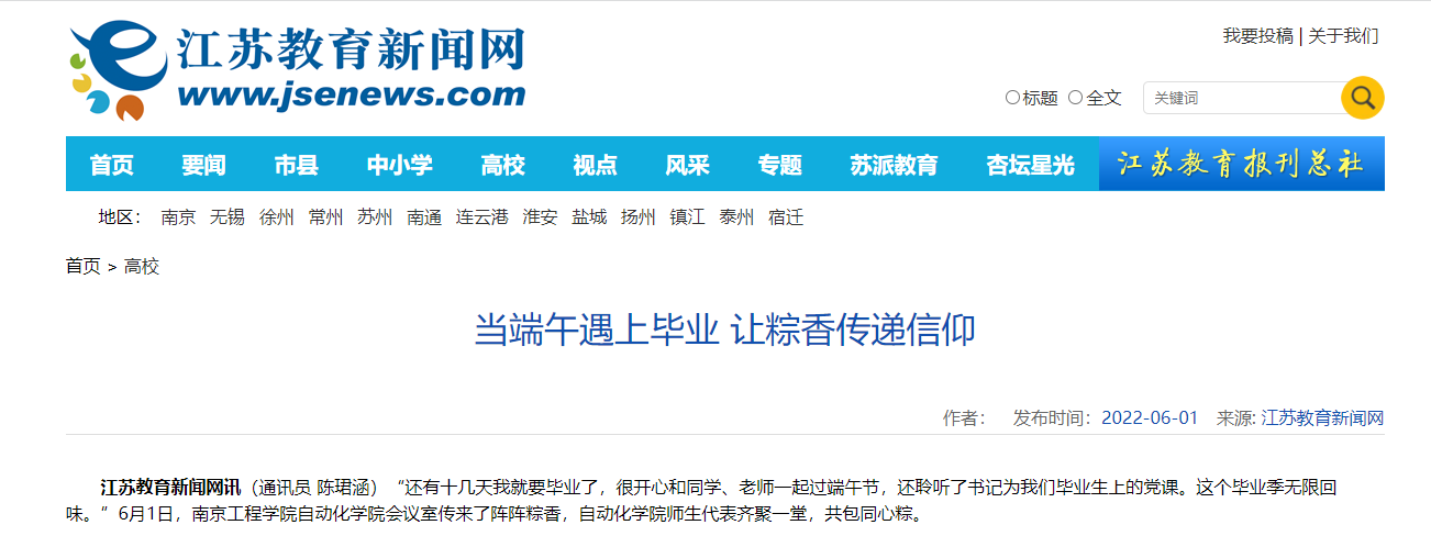 江苏教育新闻网讯(通讯员陈珺涵)“还有十几天我就要毕业了,很开心和同学、老师一起过端午节,还聆听了书记为我们毕业生上的党课。这个毕业季无限回味。”6月1日,15vip太阳集团官网自动化学院会议室传来了阵阵粽香,自动化学院师生代表齐聚一堂,共包同心粽。