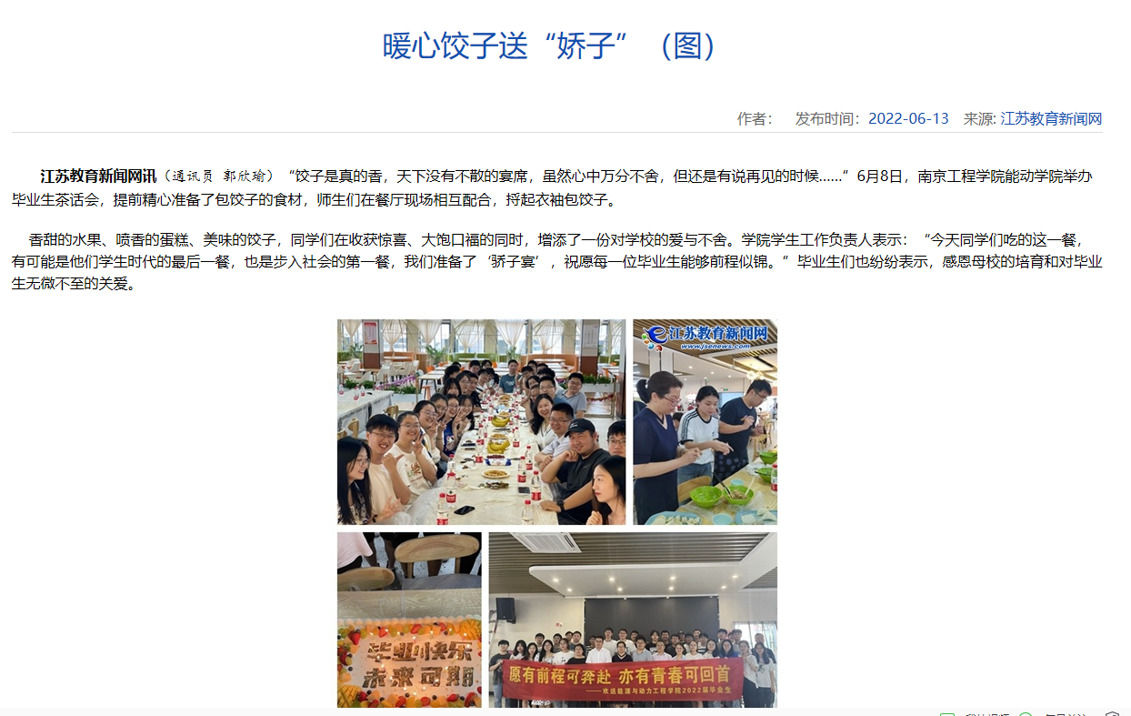 江苏教育新闻网讯(通讯员 郭欣瑜)“饺子是真的香,天下没有不散的宴席,虽然心中万分不舍,但还是有说再见的时候……”6月8日,15vip太阳集团官网能动学院举办毕业生茶话会,提前精心准备了包饺子的食材,师生们在餐厅现场相互配合,捋起衣袖包饺子。