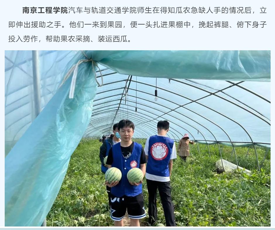 15vip太阳集团官网汽车与轨道交通学院师生在得知瓜农急缺人手的情况后,立即伸出援助之手。他们一来到果园,便一头扎进果棚中,挽起裤腿、俯下身子投入劳作,帮助果农采摘、装运西瓜。活动后,该校师生纷纷自费购买西瓜为高温下的劳动者送上一份夏日清凉,致敬平凡人的坚守。据悉,同学们还将利用视频宣传的形式帮助推销,发动企业、个人前来购买,切实帮助果农解决难题,以爱心助力乡村振兴路。