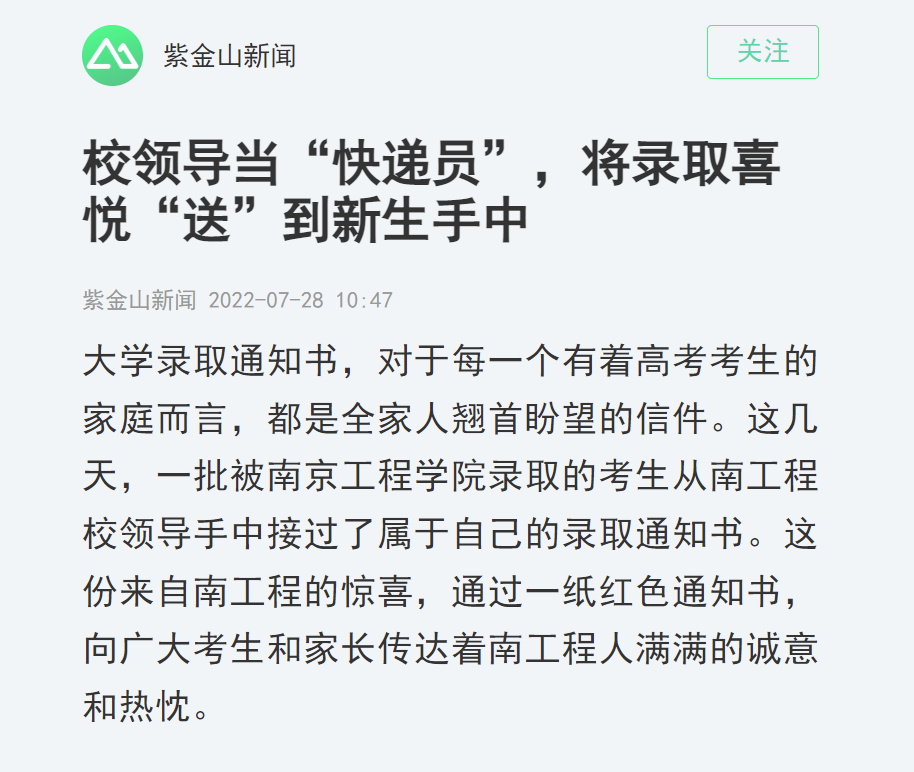 从学校领导手中接过录取通知书,新生们都很欣喜激动。他们表示,以这样的方式收到录取通知书意义非凡,感受到了南工程满满的诚意和人文情怀。欣喜之余,还要感谢中学和老师在学习上给予的悉心培养,感恩父母在生活上给予的细心照顾。未来,将昂首开启在南工程的新篇章,不辜负学校对自己的期待,不忘初心,发光发热。