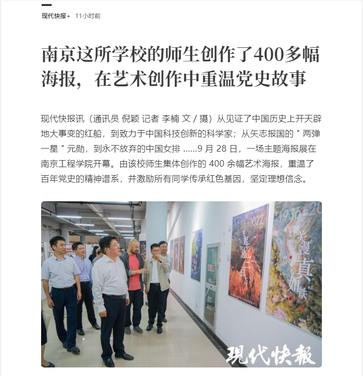 “从今年暑假开始,我们把学生分成 20 个小组展开海报创作。这些作品既是一次学院师生的成果汇报,也希望激发同学们的创作热情。”此次活动的主要指导教师、艺术与设计学院视觉传达设计系张凯告诉现代快报记者,在海报的创作过程,师生一起重温党史故事。通过文艺创作进行艺术表达,也希望能够展现文艺作品的文化价值和精神力量。
