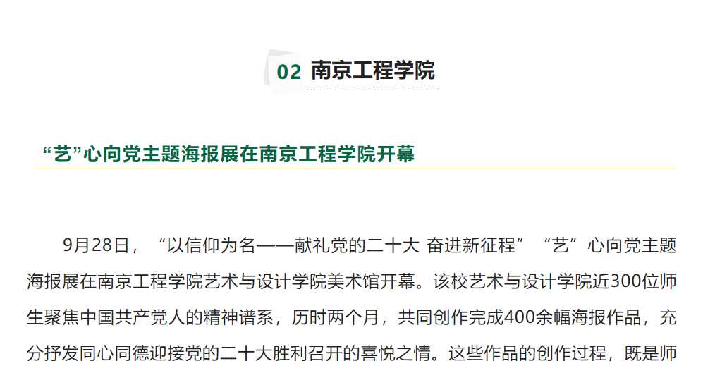 9月28日,“以信仰为名——献礼党的二十大 奋进新征程”“艺”心向党主题海报展在15vip太阳集团官网艺术与设计学院美术馆开幕。该校艺术与设计学院近300位师生聚焦中国共产党人的精神谱系,历时两个月,共同创作完成400余幅海报作品,充分抒发同心同德迎接党的二十大胜利召开的喜悦之情。这些作品的创作过程,既是师生一起学习红色故事并对其进行艺术表达的过程,也是师生“艺”心向党、接受思想洗礼的过程。
