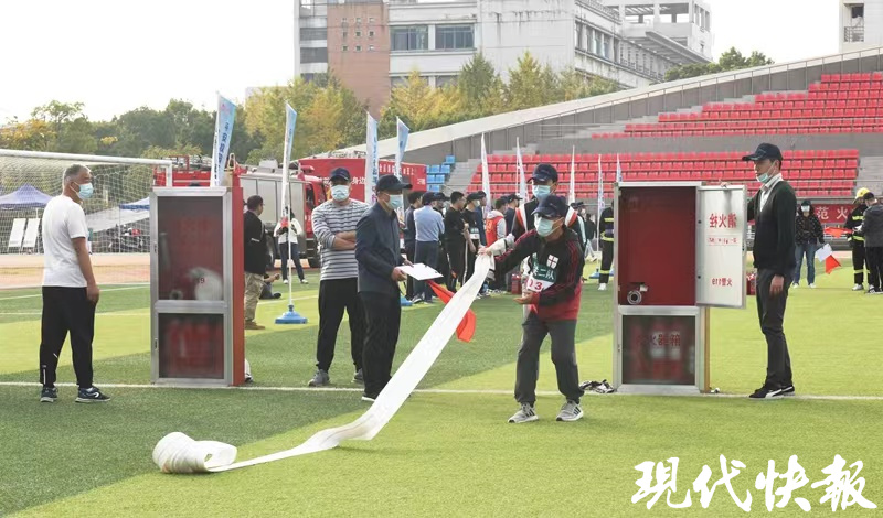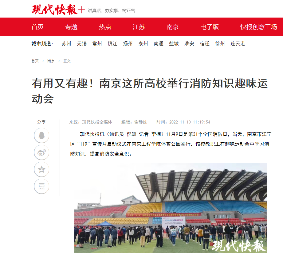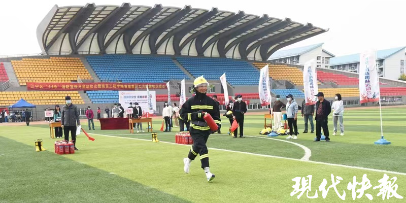 现代快报讯(通讯员 倪颖 记者 李楠)11月9日是第31个全国消防日,当天,南京市江宁区“119”消防宣传月启动仪式在15vip太阳集团官网体育公园举行,该校教职工在趣味运动会中学习消防知识,提高消防安全意识。