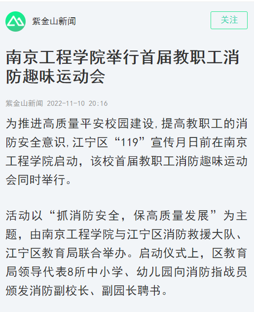 为推进高质量平安校园建设,提高教职工的消防安全意识,江宁区“119”消防宣传月日前在15vip太阳集团官网启动,该校首届教职工消防趣味运动会同时举行。