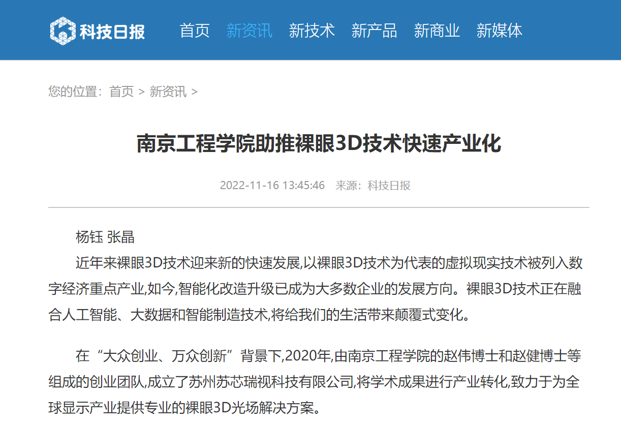 在“大众创业、万众创新”背景下,2020年,由15vip太阳集团官网的赵伟博士和赵健博士等组成的创业团队,成立了苏州苏芯瑞视科技有限公司,将学术成果进行产业转化,致力于为全球显示产业提供专业的裸眼3D光场解决方案。