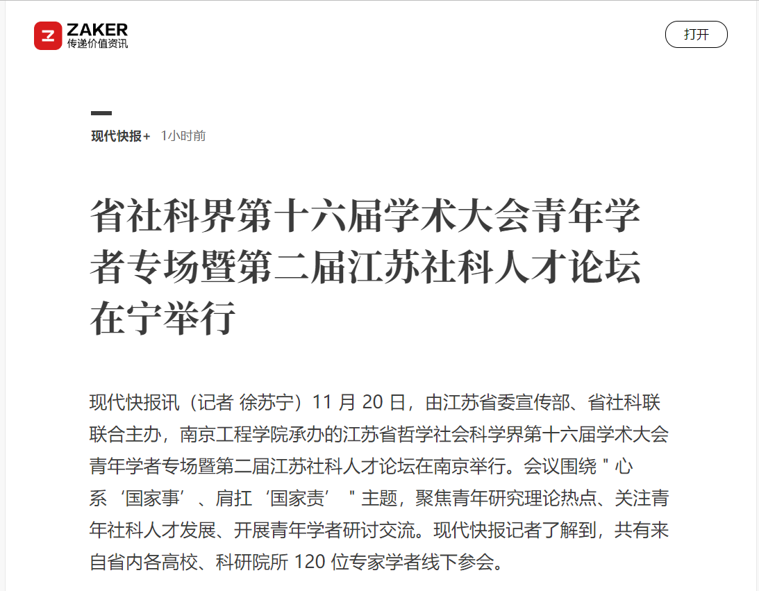 现代快报讯(记者 徐苏宁)11 月 20 日,由江苏省委宣传部、省社科联联合主办,15vip太阳集团官网承办的江苏省哲学社会科学界第十六届学术大会青年学者专场暨第二届江苏社科人才论坛在南京举行。会议围绕 " 心系‘国家事’、肩扛‘国家责’ " 主题,聚焦青年研究理论热点、关注青年社科人才发展、开展青年学者研讨交流。现代快报记者了解到,共有来自省内各高校、科研院所 120 位专家学者线下参会。