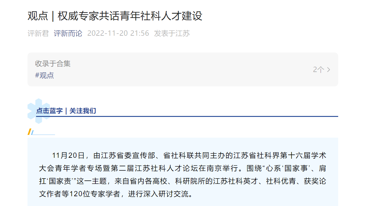 青年学者们在新征程上要以扎实学理阐释党的创新理论、要以问题导向推动理论实践融合发展、要以协同创新构建学科交叉共同体,成为中国特色哲学社会科学研究的生力军,努力回答好江苏建设、中国建设现实问题的实践考卷,展现社科人才力量与担当。
