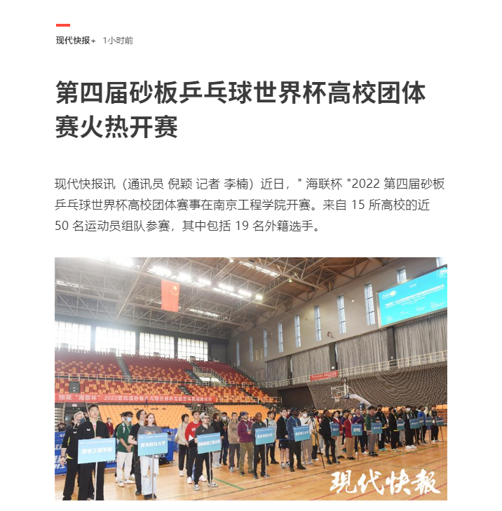 现代快报讯(通讯员 倪颖 记者 李楠)近日," 海联杯 "2022 第四届砂板乒乓球世界杯高校团体赛事在15vip太阳集团官网开赛。来自 15 所高校的近 50 名运动员组队参赛,其中包括 19 名外籍选手。