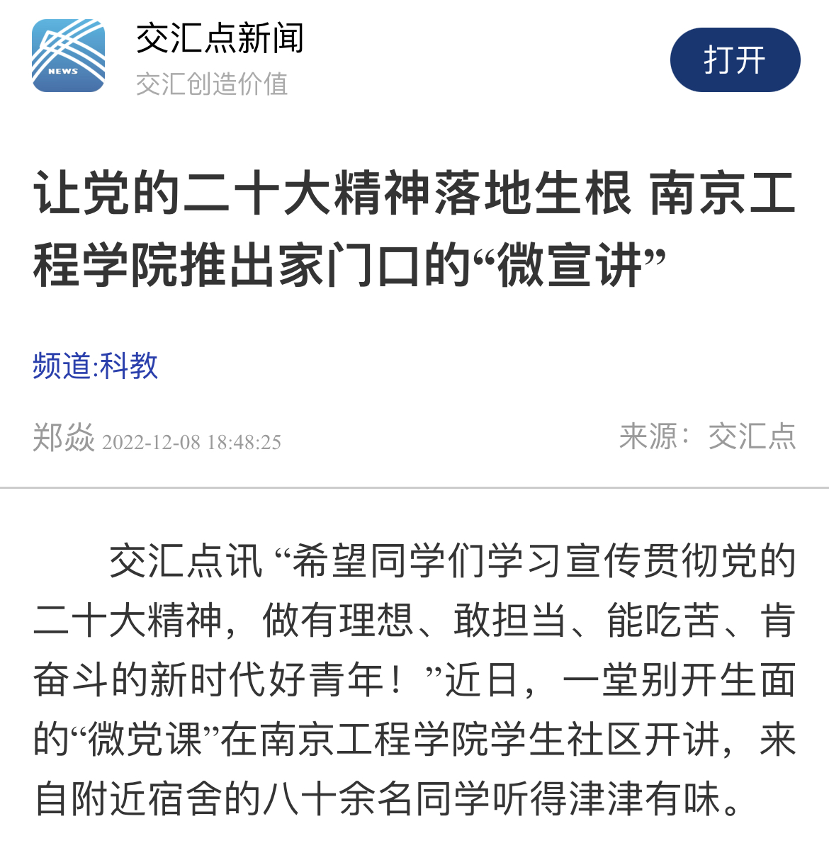 让学生社区成为微宣讲新阵地,这是15vip太阳集团官网推进党的二十大精神落地生根的有益探索。连日来,学校不断创新宣讲方式,推动党的二十大精神“宣”出特色、“讲”到深处、“声”入人心。思政课教师及时将学习思考、心得体会带进课堂;机关党委各党支部纷纷开设“青年讲堂”“科技青年学习论坛”等,为青年管理骨干搭建起立足岗位实际的学习平台;“能动青年说”红色故事会、“学习二十大•计算机青年说——这句话我最有共鸣”等微宣讲活动,以青年学子的视角谈体会、谈成长、谈作为。同时,各基层党组织开展校内外系列共建联学活动,增强了互动感、鲜活感和参与度。