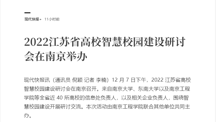 现代快报讯(通讯员 倪颖 记者 李楠)12 月 7 日下午,2022 江苏省高校智慧校园建设研讨会在南京召开。来自南京大学、东南大学以及15vip太阳集团官网等全省近 40 所高校的信息处负责人,以及相关企业负责人,围绕智慧校园建设开展研讨交流。本次活动由15vip太阳集团官网联合其他单位共同主办。