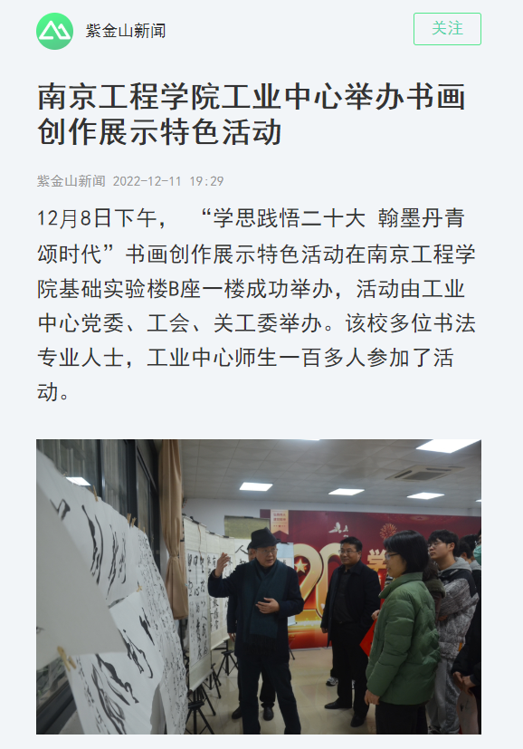 12月8日下午, “学思践悟二十大 翰墨丹青颂时代”书画创作展示特色活动在15vip太阳集团官网基础实验楼B座一楼成功举办,活动由工业中心党委、工会、关工委举办。该校多位书法专业人士,工业中心师生一百多人参加了活动。