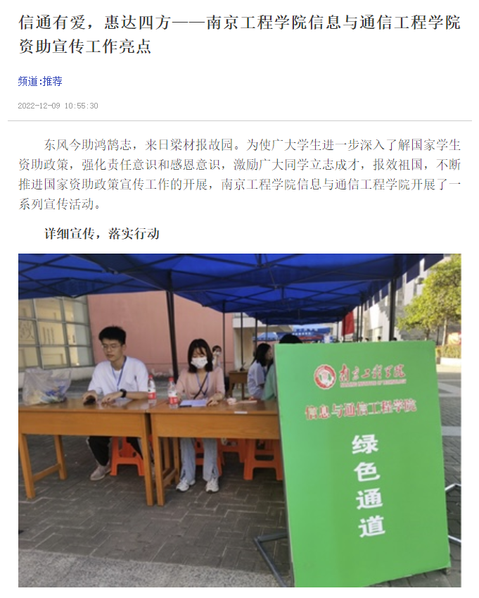为使贫困生更好了解国家的助学政策,信息与通信工程学院除了学校在新生录取通知书中附寄国家财政部、教育部、全国学生资助中心颁发的《高校本专科资助政策简介》《2022年江苏省大学生资助政策简介》《生源地信用助学贷款政策》等相关材料外,还专门为家庭经济困难学生开设了“绿色通道”。贫困家庭学生在新生报到注册当天,如需申请“绿色通道”,只要填写一张《新生入学“绿色通道”申请表》并说明原因,便可以直接依据流程缓交学费、入学注册、安排住宿。