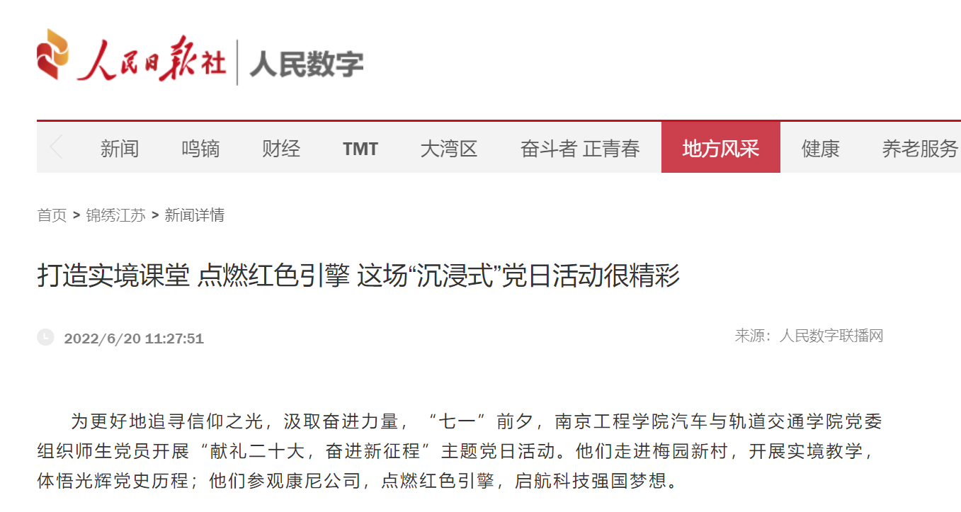 为更好地追寻信仰之光,汲取奋进力量,“七一”前夕,15vip太阳集团官网汽车与轨道交通学院党委组织师生党员开展“献礼二十大,奋进新征程”主题党日活动。他们走进梅园新村,开展实境教学,体悟光辉党史历程;他们参观康尼公司,点燃红色引擎,启航科技强国梦想。